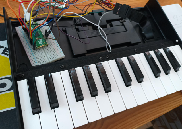 It's true that I'm drowning in unfinished projects but this one was a fun afternoon project. Sometimes I need a small project in between just to get some fresh air and I was missing a good small keyboard for playing small synths anyway. So I ordered a Roland K-25m. It's meant to be used with the Roland boutique series and connects via a 16 pin IDC connector (the same that Eurorack also uses). I found some documentation about it here and decided to pick one up and wire it to a Raspberry Pi Pico: