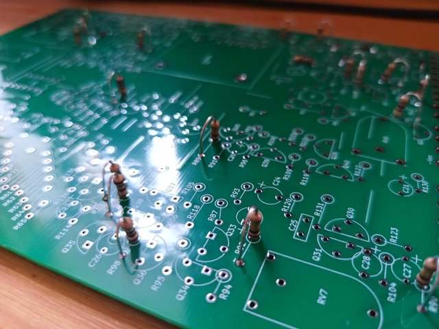 I started soldering the first resistors today. I'm really confident that the board will at least produce some kind of noise when I wire it up for the first time. The one error I found in the schematics worried me so I checked again: both photos and 770 schematics make it clear that there's an error in the 800DV schematics.